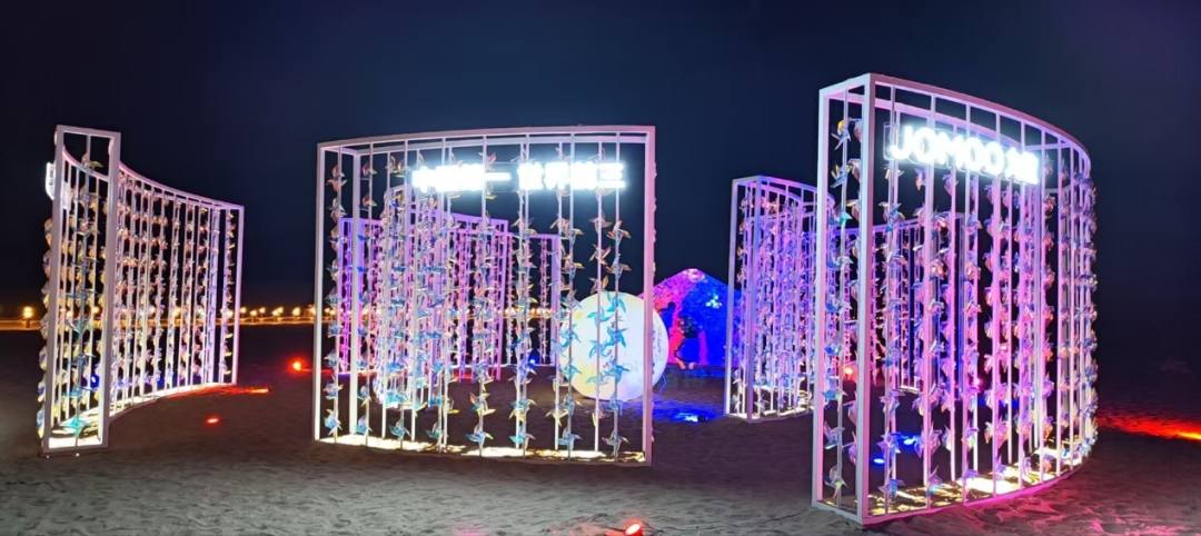 据介绍,整个装置像一个巨大光伏矩阵造型,又像是一朵正在绽放的花蕾。设计师采用科技感的镭射材质,织成上千个风车叶片,通过风沙的吹拂,在阳光的照射下如梦似幻、波光粼粼。“风生水起”这几个字寓意着敦煌充满活力和希望,也寓意着九牧财源滚滚,更寄托着对大家风调雨顺、家庭幸福的美好祝福。
