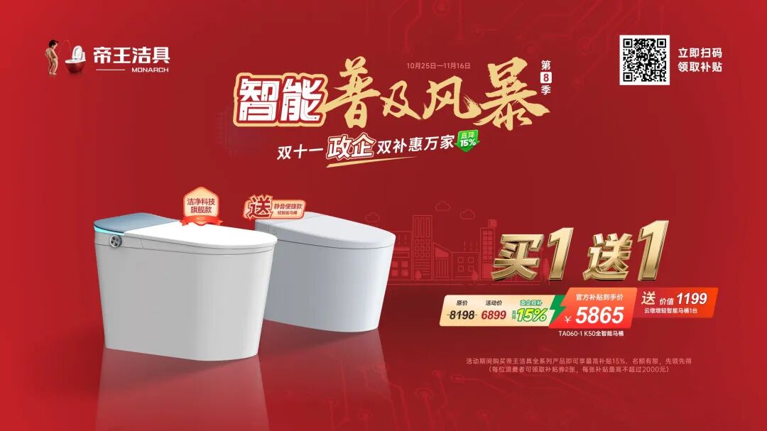 值此双十一来临之际,帝王洁具特别联动云闪付平台启动“智能普及风暴第8季”大型促销活动,即日起,通过云闪付APP搜索“帝王洁具”,即可领取品牌专属补贴券,享受额外价格减免。 本次活动涵盖多款智能卫浴产品,在原有优惠基础上,通过云闪付补贴进一步降低消费者的购买门槛,让更多家庭能够以亲民价格体验到可靠、优质的智能卫浴产品。