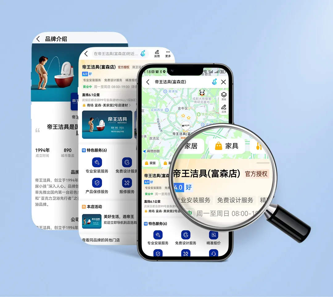 对于帝王洁具庞大的经销商网络,高德地图的平台价值深刻改变了获客与转化逻辑。当用户搜索“帝王洁具”、“帝王卫浴”、“帝王智能马桶”等关联词时,帝王官方授权门店获得优先展示权,第一时间触达有明确购买需求的潜在客户。