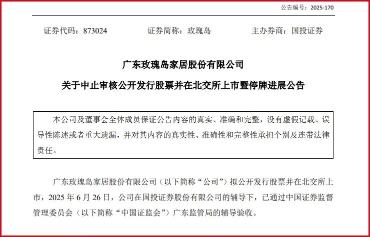 2025年12月31日,广东玫瑰岛家居股份有限公司发布公告,因上市申请文件引用的财务报告有效期即将届满,北交所已批准其中止审核的申请。