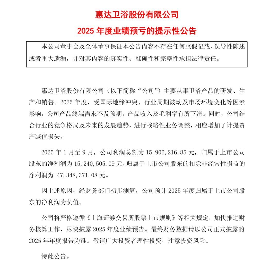 1月12日,惠达卫浴发布2025年度业绩预亏的提示性公告称,2025年度,受国际地缘冲突、行业周期波动及市场环境变化等因素影响,公司产品终端需求不及预期,产品收入及毛利率有所下滑。同时,公司结 合行业的竞争格局及未来的发展趋势,进行战略性业务调整,相应增加了计提资 产减值损失。2025年1月至9月,公司利润总额为15,906,216.85元,归属于上市公司 股东的净利润为15,240,505.09元,归属于上市公司股东的扣除非经常性损益的 净利润为-47,348,371.08元。 因上述原因,经财务部门初步测算,公司预计2025年度归属于上市公司股东的净利润为负值。