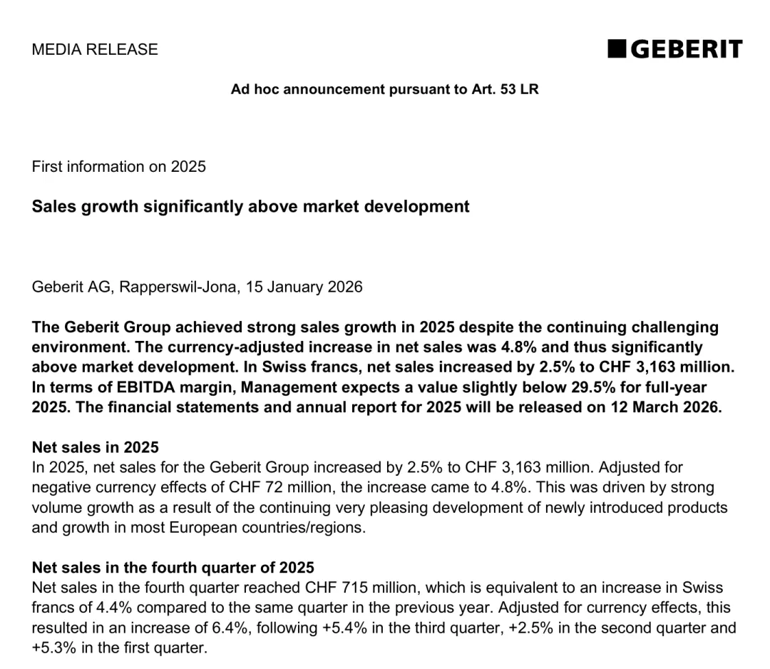 吉博力最近发布了一份新闻稿,预计2025年的销售额为31.63亿瑞士法郎(约合人民币280.73亿元),同比增长2.5%。在剔除7200万瑞士法郎的负面汇率影响后,实际增幅为4.8%。此次增长主要得益于新推出产品的持续优异表现,以及欧洲大部分国家和地区销量的提升。从产品类别来看,经汇率调整后,浴室系统的销售额增长了6.1%,安装与冲水系统的销售额增长了5.5%,而管道系统的销售额则增长了3.0%。