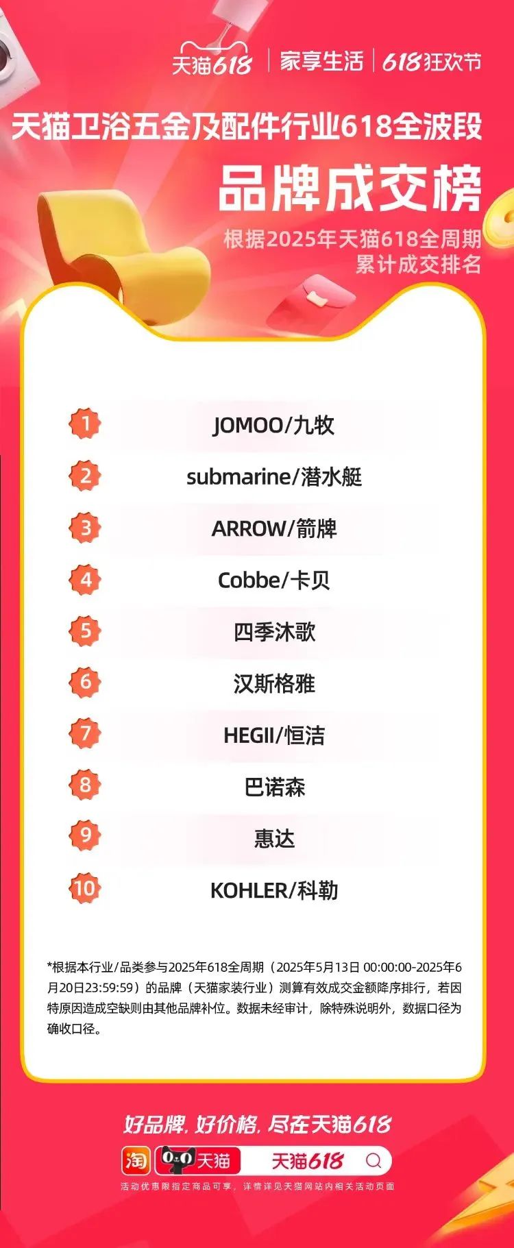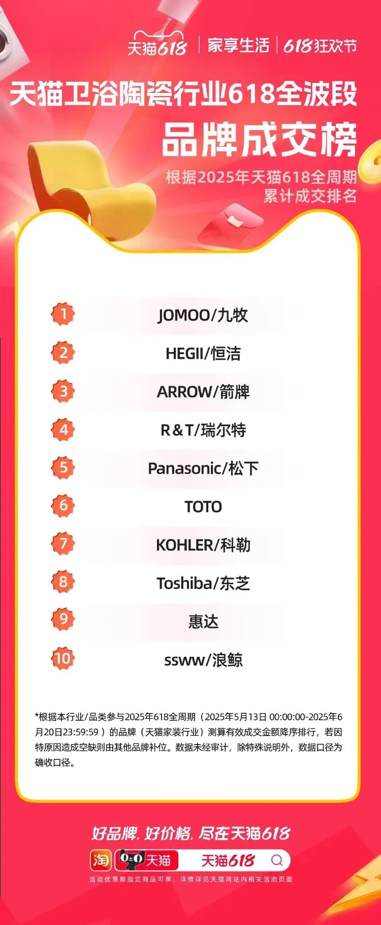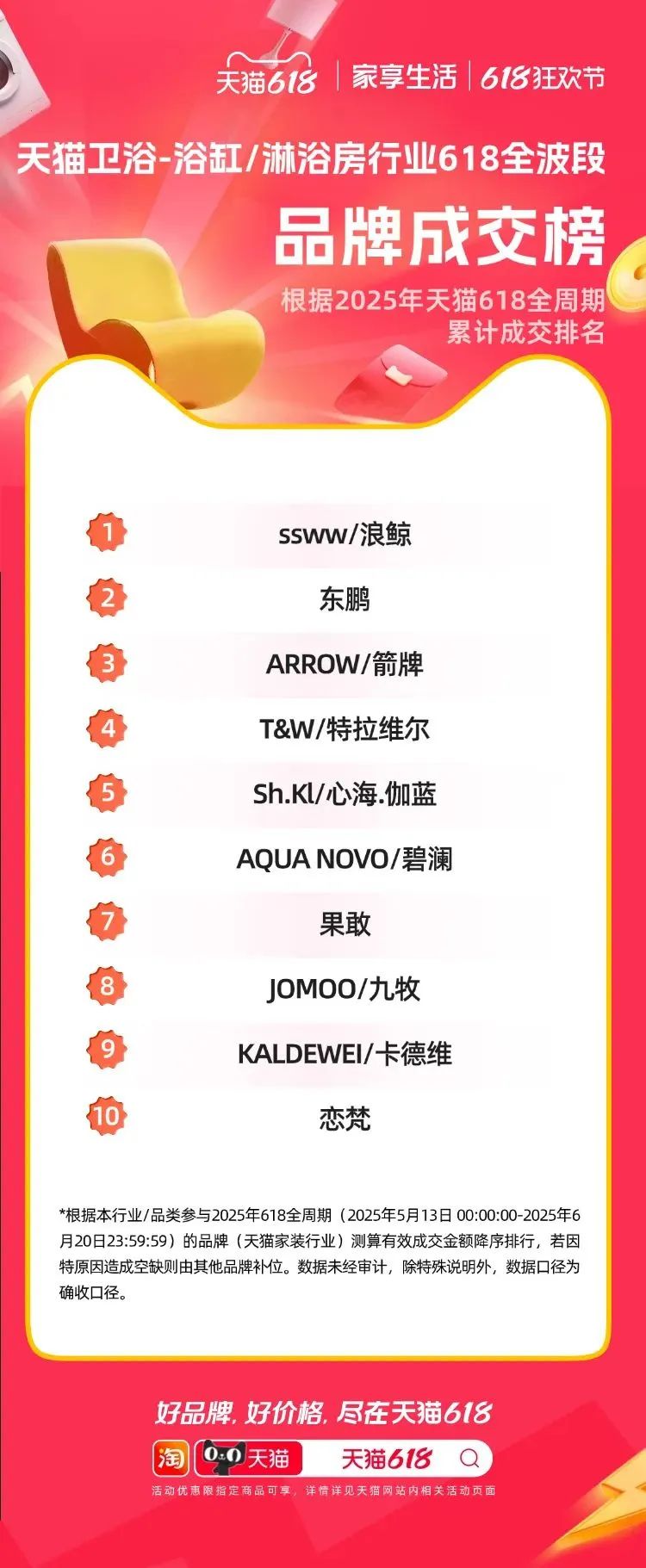 根据平台统计数据显示,在本年度618全周期(5月13日0点至6月20日24点)中,卫浴行业表现尤为抢眼,多个品牌在细分榜单中强势登榜,展现出强劲的市场活力与消费号召力。