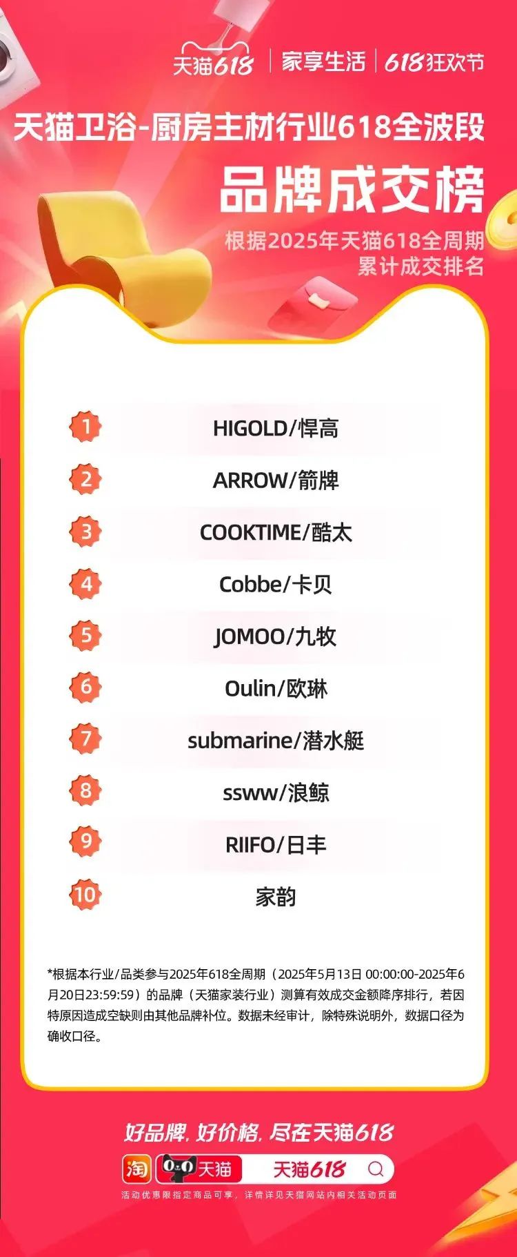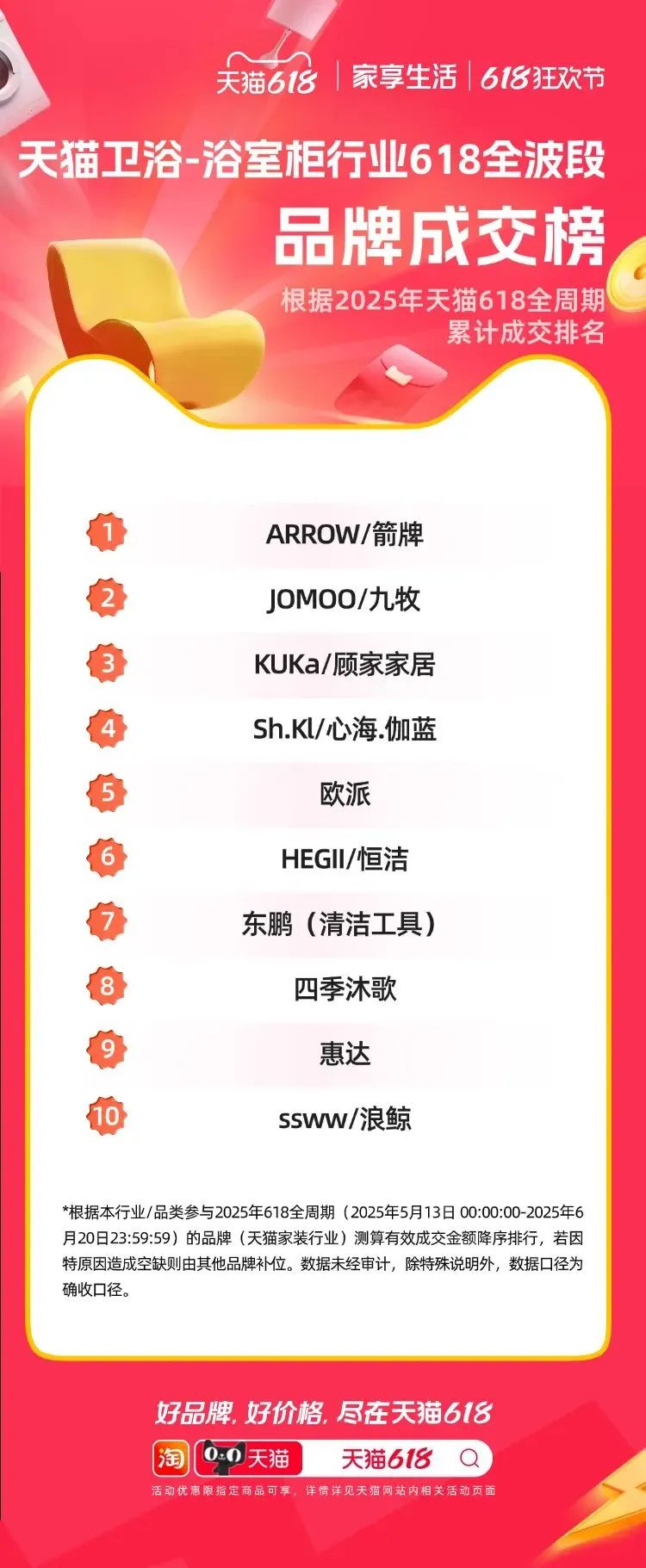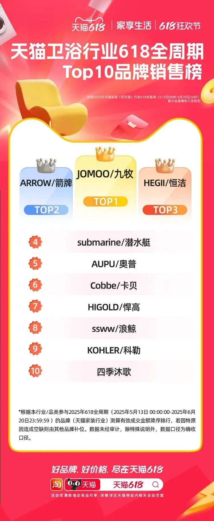 根据平台统计数据显示,在本年度618全周期(5月13日0点至6月20日24点)中,卫浴行业表现尤为抢眼,多个品牌在细分榜单中强势登榜,展现出强劲的市场活力与消费号召力。