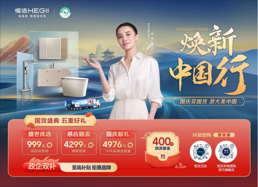 在“金九银十”到来之际,恒洁“以旧换新”再行动,“恒洁焕新中国行·国货盛典”燃情开启,买恒洁,游大美中国!自9月1日开始,活动以政企双补、壕送400万旅游基金、智能爆款与国庆套餐一站配齐等五重好礼的丰厚福利,迅速在全国铺开,持续在终端市场发酵,再次引发一场焕新风暴,影响力、参与度、覆盖面再创新高。