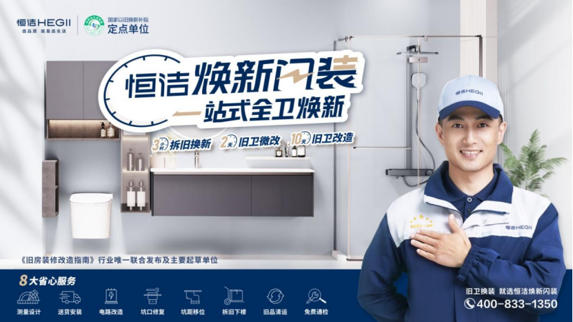 显然,恒洁已洞察这一核心痛点,并通过“恒洁焕新闪装服务” 给出针对性解决方案,以“3小时拆旧换新+8大省心服务”,从旧马桶拆除、换新到电路改造,一站式解决全流程需求,成功打通了以旧换新的最后一公里。